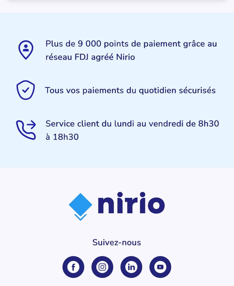 Pour trouver un buraliste du réseau FDJ agréé Nirio près de chez vous, utilisez la fonction de géolocalisation intégrée à l’app Nirio. Elle vous indiquera les points de paiement les plus proches, ainsi que des informations essentielles telles que les jours et les horaires d’ouverture ou encore l’adresse exacte du commerce.